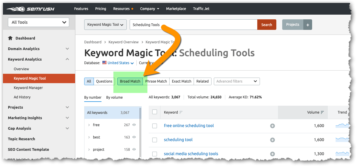 Broad Match selection option in SEMrush, a premium SEO research tool.